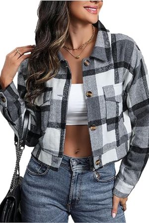 Cropped Plaid Shacket Jacket Button Down Long Sleeve Shirts