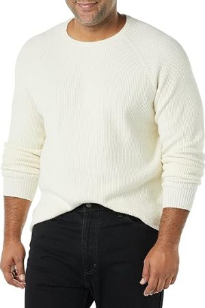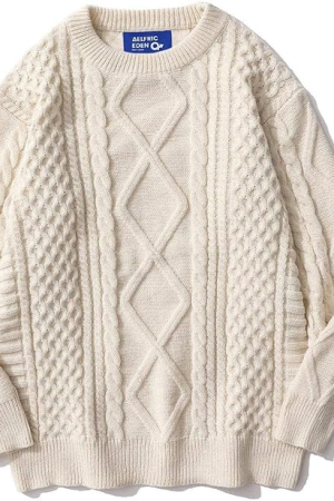 Cream Sweater Men Woven Crewneck Knitted Pullover