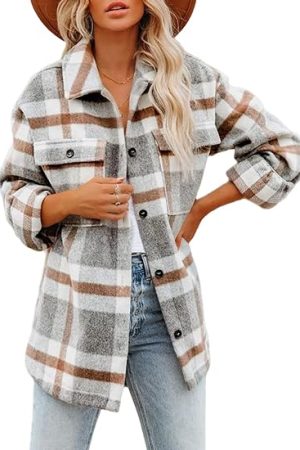 Cropped Plaid Shacket Jacket Button Down Long Sleeve Shirts