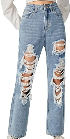 Print Elastic Waist Wide Leg Ripped Jeans Denim Pants